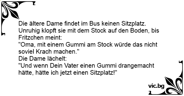 Die ältere Dame findet im Bus keinen Sitzplatz. Unruhig klopft sie mit dem Stock auf den Boden, bis Fritzchen meint: