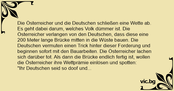 Die Österreicher und die Deutschen schließen eine Wette ab. Es geht dabei darum, welches Volk dümmer ist. Die Österreicher verlangen von den Deutschen, dass diese eine 200 Meter lange Brücke mitten in die Wüste bauen. Die Deutschen vermuten einen Trick hinter dieser Forderung und beginnen sofort mit den Bauarbeiten. Die Österreicher lachen sich darüber tot. Als dann die Brücke endlich fertig ist, wollen die Österreicher ihre Wettprämie einlösen und spotten: