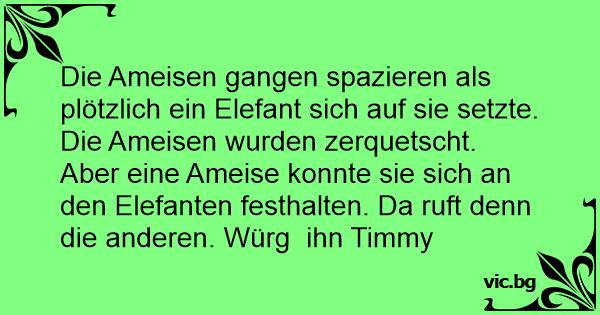 Die Ameisen gangen spazieren als plötzlich ein Elefant sich auf sie setzte. Die Ameisen wurden zerquetscht. Aber eine Ameise konnte sie sich an den Elefanten festhalten. Da ruft denn die anderen. Würg ihn Timmy