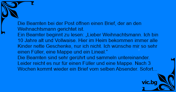 Die Beamten sind sehr gerührt und sammeln untereinander. Leider reicht es nur für einen Füller und eine Mappe. Nach 3 Wochen kommt wieder ein Brief vom selben Absender. Sofort öffnet einer den Brief und beginnt laut zu lesen: