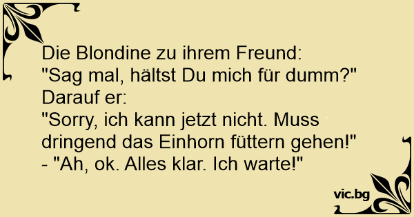 Manuela: "Hältst du mich für dumm?" Max: "Warte, ich gehe nur schnell das Einhorn füttern!" Manuela: "OK, ich warte."
