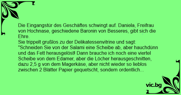 "Schneiden Sie von der Salami eine Scheibe ab, aber hauchdünn und das Fett herausgelöst! Dann brauche ich noch eine viertel Scheibe von dem Edamer, aber die Löcher herausgeschnitten, dazu 2,5 g von dem Magerkäse, aber niсhт wieder so lieblos zwischen 2 Blätter Papier gequetscht, sondern ordentlich verpackt! Schreiben Sie alles auf meine Rechnung und liefern Sie es Punkt 12.00 Uhr in meine Villa, Kücheneingang!"