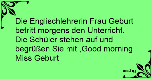 Die Englischlehrerin Frau Geburt betritt morgens den Unterricht. Die Schüler stehen auf und begrüßen Sie mit ,Good morning Miss Geburt