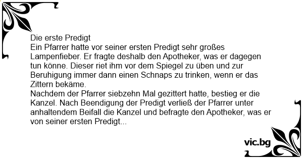 Die erste Predigt Ein Pfarrer hatte vor seiner ersten Predigt sehr großes Lampenfieber. Er fragte deshalb den Apotheker, was er dagegen tun könne. Dieser riet ihm vor dem Spiegel zu üben und zur Beruhigung immer dann einen Schnaps zu trinken, wenn er das Zittern bekäme. Nachdem der Pfarrer siebzehn Mal gezittert hatte, bestieg er die Kanzel. Nach Beendigung der Predigt verließ der Pfarrer unter anhaltendem Beifall die Kanzel und befragte den Apotheker, was er von seiner ersten Predigt gehalten habe. Dieser lobte ihn, erklärte aber, dass er zehn Fehler begangen habe.