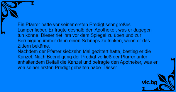 Ein Pfarrer hatte vor seiner ersten Predigt sehr großes Lampenfieber. Er fragte deshalb den Apotheker, was er dagegen tun könne. Dieser riet ihm vor dem Spiegel zu üben und zur Beruhigung immer dann einen Schnaps zu trinken, wenn er das Zittern bekäme.