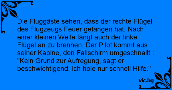 "Kein Grund zur Aufregung, meine Herrschaften", sagt der Pilot und springt mit dem Fallschirm aus dem brennenden Flugzeug, "ich hole nur Hilfe."