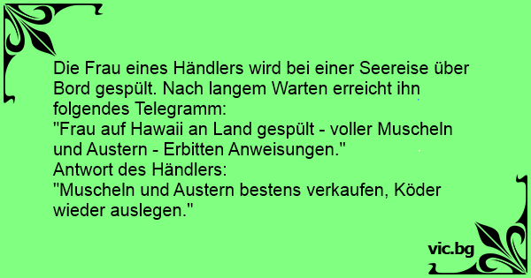 Die Frau eines Händlers wird bei einer Seereise über Bord gespült. Nach langem Warten erreicht ihn folgendes Telegramm:
