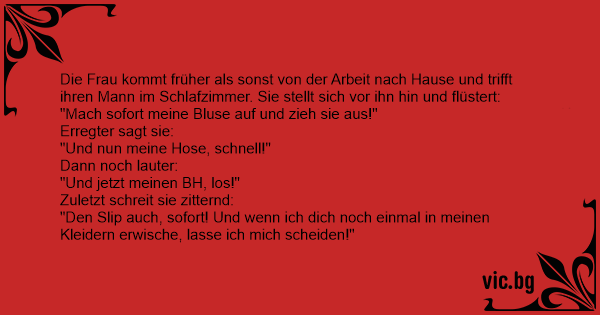 Die Frau kommt früher als sonst von der Arbeit nach Hause und trifft ihren Mann im Schlafzimmer. Sie stellt sich vor ihn hin und flüstert: