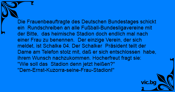 Die Frauenbeauftragte des Deutschen Bundestages schickt ein Rundschreiben an alle Fußball-Bundesligavereine mit der Bitte, das heimische Stadion doch endlich mal nach einer Frau zu benennen. Der einzige Verein, der sich meldet, ist Schalke 04. Der Schalker Präsident teilt der Dame am Telefon stolz mit, daß er sich entschlossen habe, ihrem Wunsch nachzukommen. Hocherfreut fragt sie: