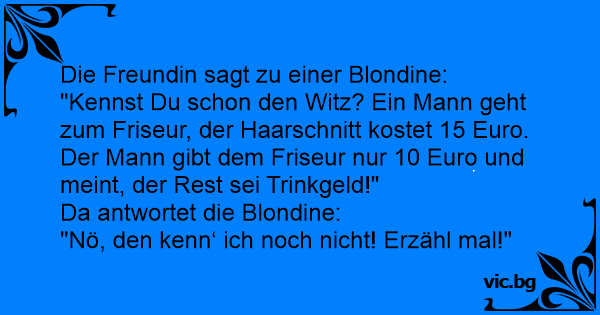 "Kennst Du schon den Witz? Ein Mann geht zum Friseur, der Haarschnitt kostet 15 Euro. Der Mann gibt dem Friseur nur 10 Euro und meint, der Rest sei Trinkgeld!"