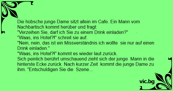 Мъж влиза в претъпкано заведение. Вижда красиво младо момиче, което седи само на една маса и се приближава към него: