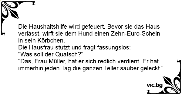 Die Haushaltshilfe wird gefeuert. Bevor sie das Haus verlässt, wirft sie dem Hund einen Zehn-Euro-Schein in sein Körbchen.