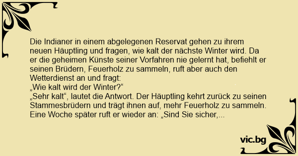 Zwei Indianer gehen zum Medizinmann und fragen ihn wie der Winter wird. Der wirft ein paar Steine in die Luft und sagt: "Es wird ein kalter Winter. Geht in den Wald und sammelt viel Holz." Am...