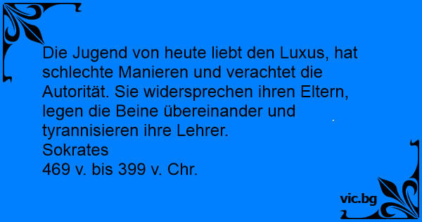 Die Jugend von heute liebt den Luxus, hat schlechte Manieren und verachtet die Autorität. Sie widersprechen ihren Eltern, legen die Beine übereinander und tyrannisieren ihre Lehrer.