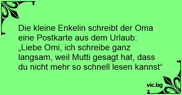 Kleine Mieke wou een brief aan oma schrijven. Ze schreef: "Lieve oma, ik schrijf heel langzaam omdat ik weet dat u niet snel kan lezen."