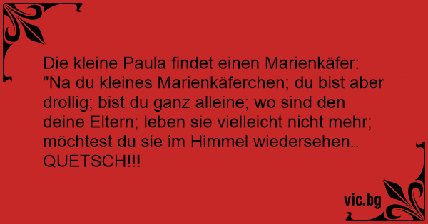 "Na du kleines Marienkäferchen; du bist aber drollig; bist du ganz alleine; wo sind den deine Eltern; leben sie vielleicht niсhт mehr; möchtest du sie im Himmel wiedersehen.. QUETSCH!!!
