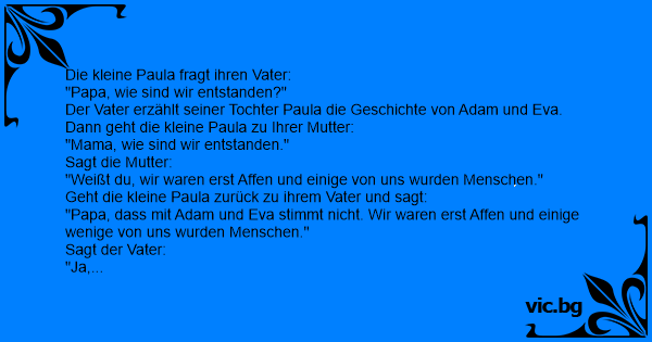 Puisēns jautā tēvam: - «Kā radās cilvēki?» Tēvs: - «Reiz dzīvoja Ieva un Ādams. Viņiem piedzima bērni, pēc tam bērnu bērni un tā tālāk.» Puisēns aizskrien pie mammas: - «Mammu, kā radās cilvēki?»...