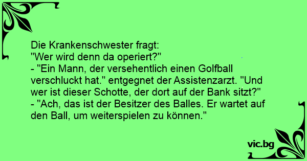 - "Ein Mann, der versehentlich einen Golfball verschluckt hat." entgegnet der Assistenzarzt. "Und wer ist dieser Schotte, der dort auf der Bank sitzt?"