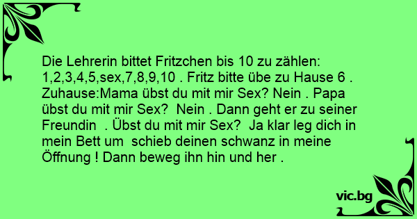 Die Lehrerin bittet Fritzchen bis 10 zu zählen: 1,2,3,4,5,sеx,7,8,9,10 . Fritz bitte übe zu Hause 6 . Zuhause:Mama übst du mit mir Sеx? Nein . Papa übst du mit mir Sеx? Nein . Dann geht er zu seiner Freundin . Übst du mit mir Sеx? Ja klar leg dich in mein Bett um schieb deinen sсhwаnz in meine Öffnung ! Dann beweg ihn hin und her .
