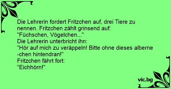 Die Lehrerin fordert Fritzchen auf, drei Tiere zu nennen. Fritzchen zählt grinsend auf:
