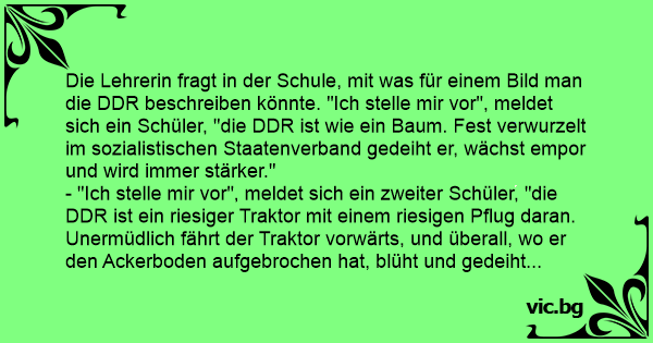 Die Lehrerin fragt in der Schule, mit was für einem Bild man die DDR beschreiben könnte. "Ich stelle mir vor", meldet sich ein Schüler, "die DDR ist wie ein Baum. Fest verwurzelt im sozialistischen Staatenverband gedeiht er, wächst empor und wird immer stärker."