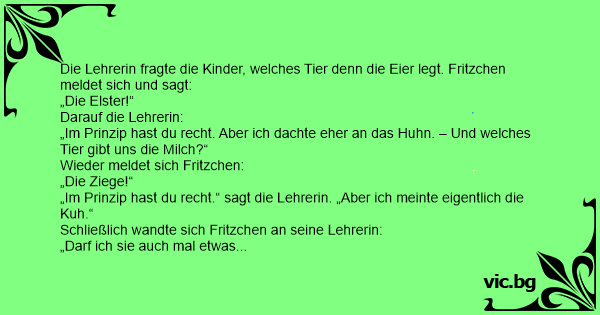 Die Lehrerin fragte die Kinder, welches Tier denn die Eier legt. Fritzchen meldet sich und sagt: