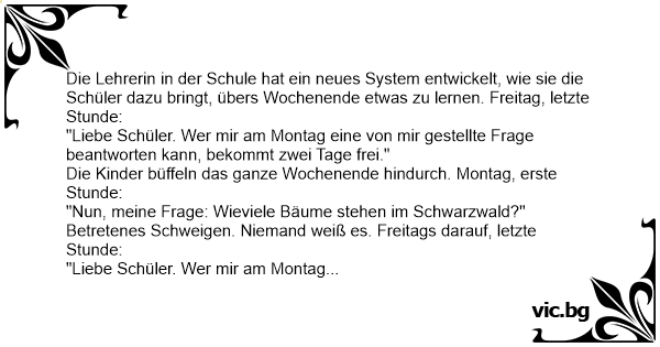 "Liebe Schüler. Wer mir am Montag eine von mir gestellte Frage beantworten kann, bekommt zwei Tage frei."