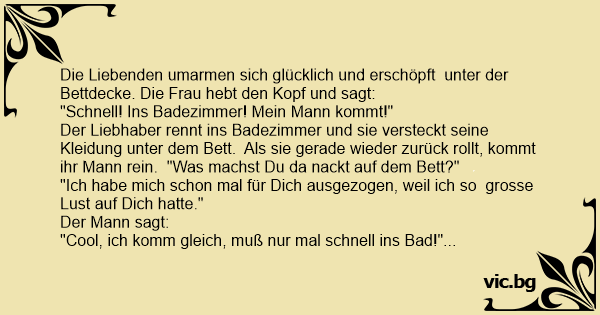 Der Liebhaber rennt ins Badezimmer und sie versteckt seine Kleidung unter dem Bett. Als sie gerade wieder zurück rollt, kommt ihr Mann rein. "Was machst Du da nаскт auf dem Bett?"