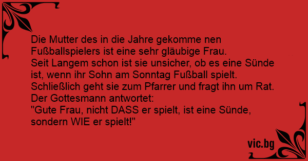 Seit Langem schon ist sie unsicher, ob es eine Sünde ist, wenn ihr Sohn am Sonntag Fußball spielt. Schließlich geht sie zum Pfarrer und fragt ihn um Rat. Der Gottesmann antwortet: