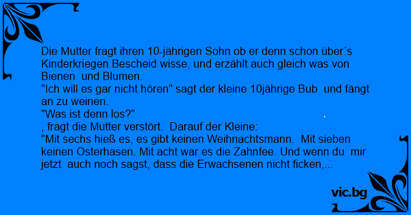 Die Mutter fragt ihren 10-jährigen Sohn ob er denn schon über´s Kinderkriegen Bescheid wisse, und erzählt auch gleich was von Bienen und Blumen.