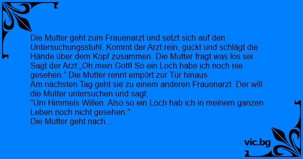 Die Mutter geht zum Frauenarzt und setzt sich auf den Untersuchungsstuhl. Kommt der Arzt rein, guckt und schlägt die Hände über dem Kopf zusammen. Die Mutter fragt was los sei. Sagt der Arzt:„Oh mein Gott! So ein Loch habe ich noch nie gesehen.“ Die Mutter rennt empört zur Tür hinaus.