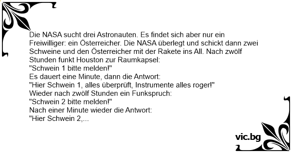 Eine Raumkapsel, besetzt mit 2 Schweinen und dem Burgenländer Gustl Güssinger, fliegt durchs All. Plötzlich kommt ein Funkspruch: "Hier spricht Houston. Schwein eins, bitte drücken sie den roten Knopf." Schwein eins drückt den roten Knopf. Später kommt ein weiterer Funkspruch: "Hier spricht...