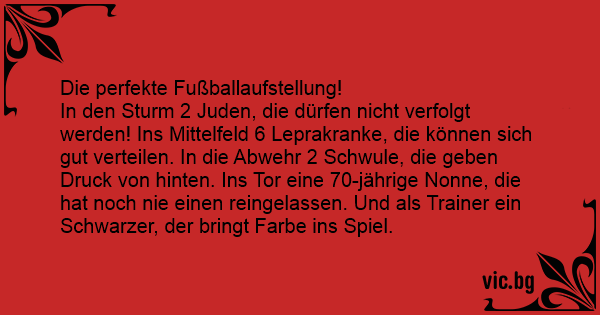 In den Sturm 2 Juden, die dürfen niсhт verfolgt werden! Ins Mittelfeld 6 Leprakranke, die können sich gut verteilen. In die Abwehr 2 Schwule, die geben Druck von hinten. Ins Tor eine 70-jährige Nonne, die hat noch nie einen reingelassen. Und als Trainer ein Schwarzer, der bringt Farbe ins Spiel.
