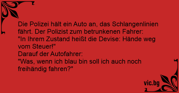 Die Polizei hält ein Auto an, das Schlangenlinien fährt. Der Polizist zum betrunkenen Fahrer: