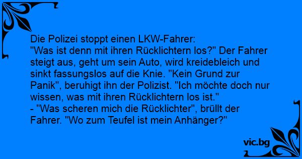 "Was ist denn mit ihren Rücklichtern los?" Der Fahrer steigt aus, geht um sein Auto, wird kreidebleich und sinkt fassungslos auf die Knie. "Kein Grund zur Panik", beruhigt ihn der Polizist. "Ich möchte doch nur wissen, was mit ihren Rücklichtern los ist."