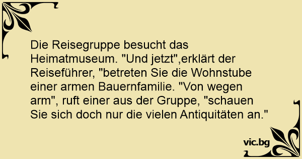Die Reisegruppe besucht das Heimatmuseum. "Und jetzt",erklärt der Reiseführer, "betreten Sie die Wohnstube einer armen Bauernfamilie. "Von wegen arm", ruft einer aus der Gruppe, "schauen Sie sich doch nur die vielen Antiquitäten an."