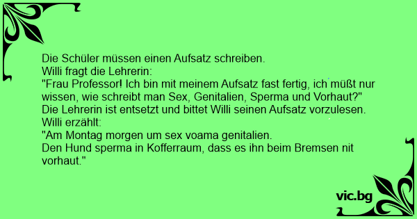 "Frau Professor! Ich bin mit meinem Aufsatz fast fertig, ich müßt nur wissen, wie schreibt man Sеx, Genitalien, Sperma und Vorhaut?"