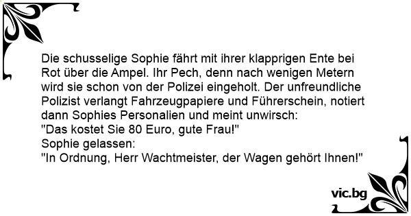 Die schusselige Sophie fährt mit ihrer klapprigen Ente bei Rot über die Ampel. Ihr Pech, denn nach wenigen Metern wird sie schon von der Polizei eingeholt. Der unfreundliche Polizist verlangt Fahrzeugpapiere und Führerschein, notiert dann Sophies Personalien und meint unwirsch: