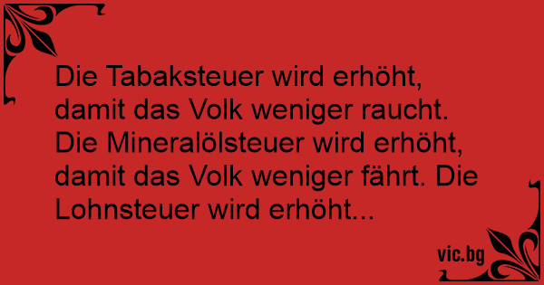 Die Tabaksteuer wird erhöht, damit das Volk weniger raucht. Die Mineralölsteuer wird erhöht, damit das Volk weniger fährt. Die Lohnsteuer wird erhöht...