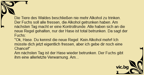 Der Fuchs soll alle fressen, die Alkohol getrunken haben. Am nächsten Tag macht er eine Kontrollrunde. Alle haben sich an die neue Regel gehalten, nur der Hase ist total betrunken. Da sagt der Fuchs: