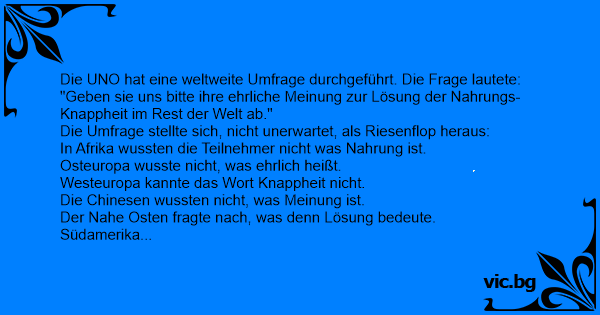 A ONU resolveu fazer uma pesquisa em todo o mundo. Enviou uma carta para o representante de cada país com a pergunta: "Por favor, diga honestamente qual é a sua opinião sobre a escassez de alimentos no resto do mundo". Mas pesquisa foi um grande fracasso. Todos os países europeus não entenderam...
