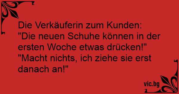 Verkoopster: "De eerste dagen zullen de schoenen wel een beetje knellen." Klant: "Geeft niet, Ik doe ze toch pas over een week aan!"
