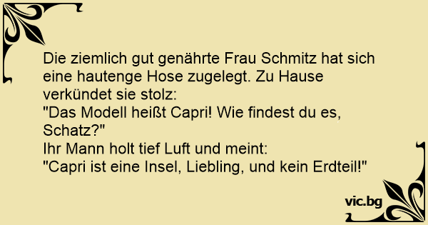 Die ziemlich gut genährte Frau Schmitz hat sich eine hautenge Hose zugelegt. Zu Hause verkündet sie stolz: