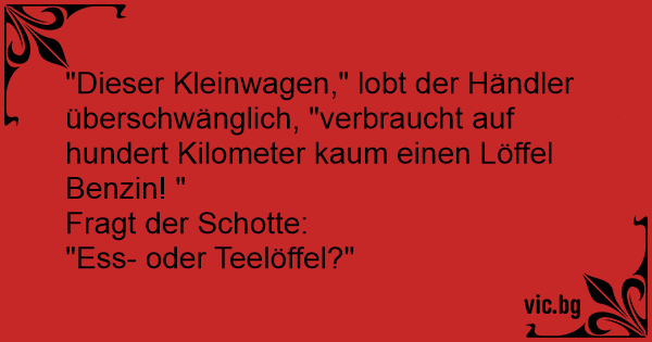 "Dieser Kleinwagen," lobt der Händler überschwänglich, "verbraucht auf hundert Kilometer kaum einen Löffel Benzin! "