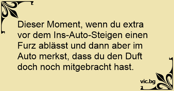 Dieser Moment, wenn du extra vor dem Ins-Auto-Steigen einen Furz ablässt und dann aber im Auto merkst, dass du den Duft doch noch mitgebracht hast.