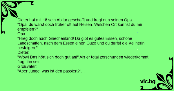 "Naja, die Landschaft war schön, das Essen gut und den Ouzo gabs auch. Aber als ich die Kellnerin besteigen wollte, riefen alle ‚Vergerwaltigung!‘ und verprügelten mich."