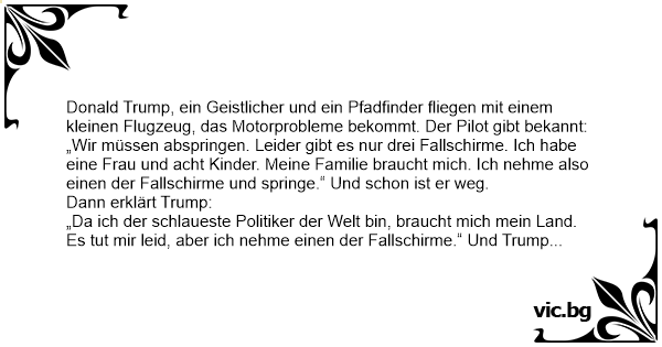 In einem Flugzeug sitzen 4 Leute: Trump, ein Egoist, der Papst und ein 10-jähriger Junge. Da kommt der Pilot und sagt: „Es gibt ein Problem mit der Maschine, ihr müsst leider alle abspringen. Ich...