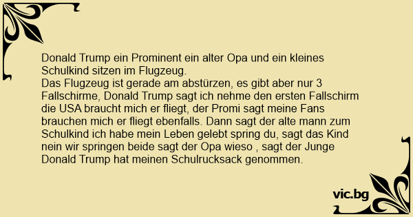 Das Flugzeug ist gerade am abstürzen, es gibt aber nur 3 Fallschirme, Donald Trump sagt ich nehme den ersten Fallschirm die USA braucht mich er fliegt, der Promi sagt meine Fans brauchen mich er fliegt ebenfalls. Dann sagt der alte mann zum Schulkind ich habe mein Leben gelebt spring du, sagt das Kind nein wir springen beide sagt der Opa wieso , sagt der Junge Donald Trump hat meinen Schulrucksack genommen.