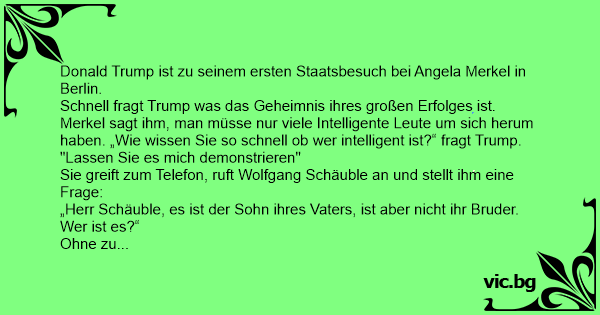 „Sehen Sie“, sagt Merkel zu Trump, „so теsте ich die Intelligenz der Leute.“ Begeistert fliegt Trump nach Hause, er ruft sofort seinen Vize Pence an, um ihm dieselbe Frage zu stellen. „Es ist der Sohn deines Vaters, ist aber niсhт dein Bruder. Wer ist es?“