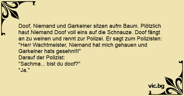 Doof, Niemand und Garkeiner sitzen aufm Baum. Plötzlich haut Niemand Doof voll eins auf die Schnauze. Doof fängt an zu weinen und rennt zur Polizei. Er sagt zum Polizisten: